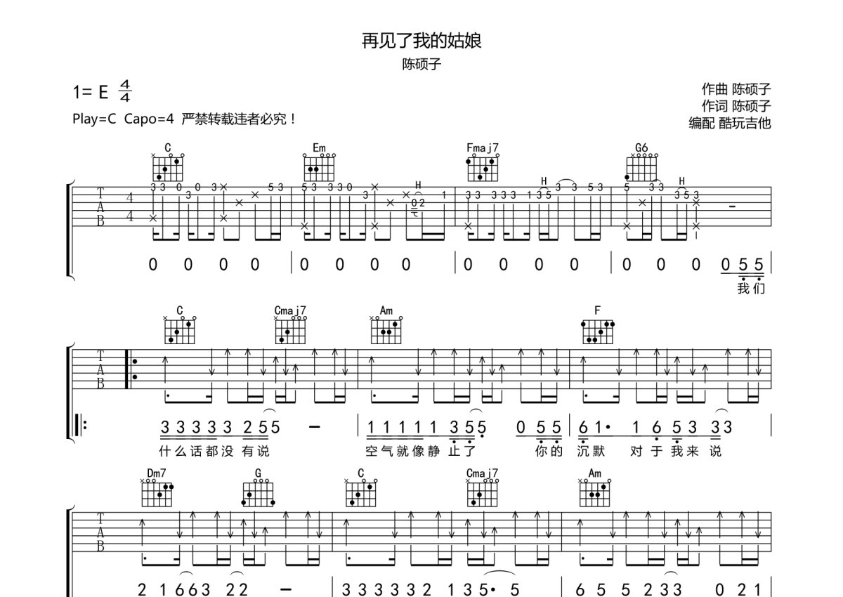 陈硕子《再见了我的姑娘》吉他谱 - C调弹唱六线谱