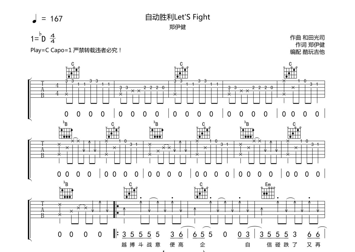 《自动胜利《数码宝贝》主题曲粤语版》是郑伊健演唱的一首歌曲,本吉他谱采用的是C调指法编配,这份吉他谱共有四张高清图谱,图谱由 @酷玩吉他 编配上传,图谱使用六线谱编配,包含吉他和弦指法、简谱以及歌词部分,曲谱配备了相关的音频提供试听,使用这份自动胜利《数码宝贝》主题曲粤语版吉他谱,可以让你更加方便地掌握这首歌曲的弹唱技巧,快来尝试吧。自动胜利《数码宝贝》主题曲粤语版 。