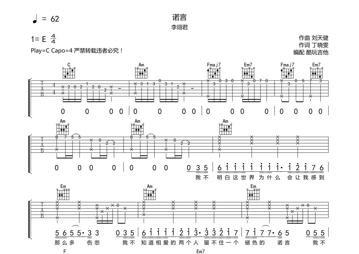 李翊君《诺言》吉他谱 - C调弹唱六线谱