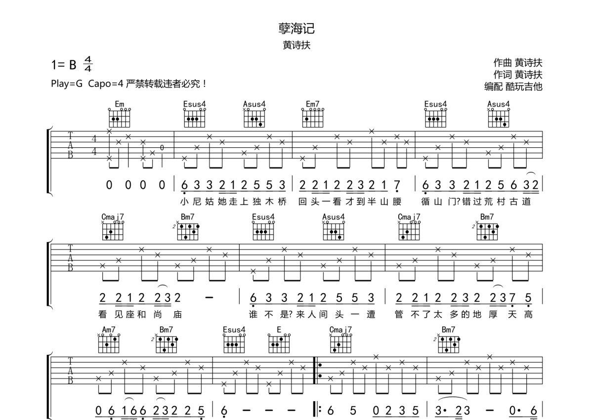 《孽海记》是黄诗扶演唱的一首歌曲,本吉他谱采用的是G调指法编配,这份吉他谱共有两张高清图谱,图谱由 @酷玩吉他 编配上传,图谱使用六线谱编配,包含吉他和弦指法、简谱以及歌词部分,曲谱配备了相关的音频提供试听,使用这份孽海记吉他谱,可以让你更加方便地掌握这首歌曲的弹唱技巧,快来尝试吧。G调弹唱谱高清 。
