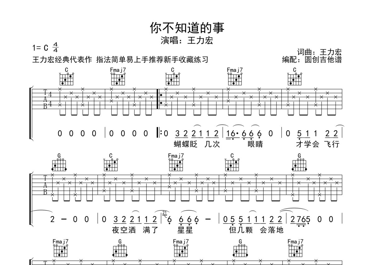 王力宏《你不知道的事》吉他谱 - C调弹唱六线谱