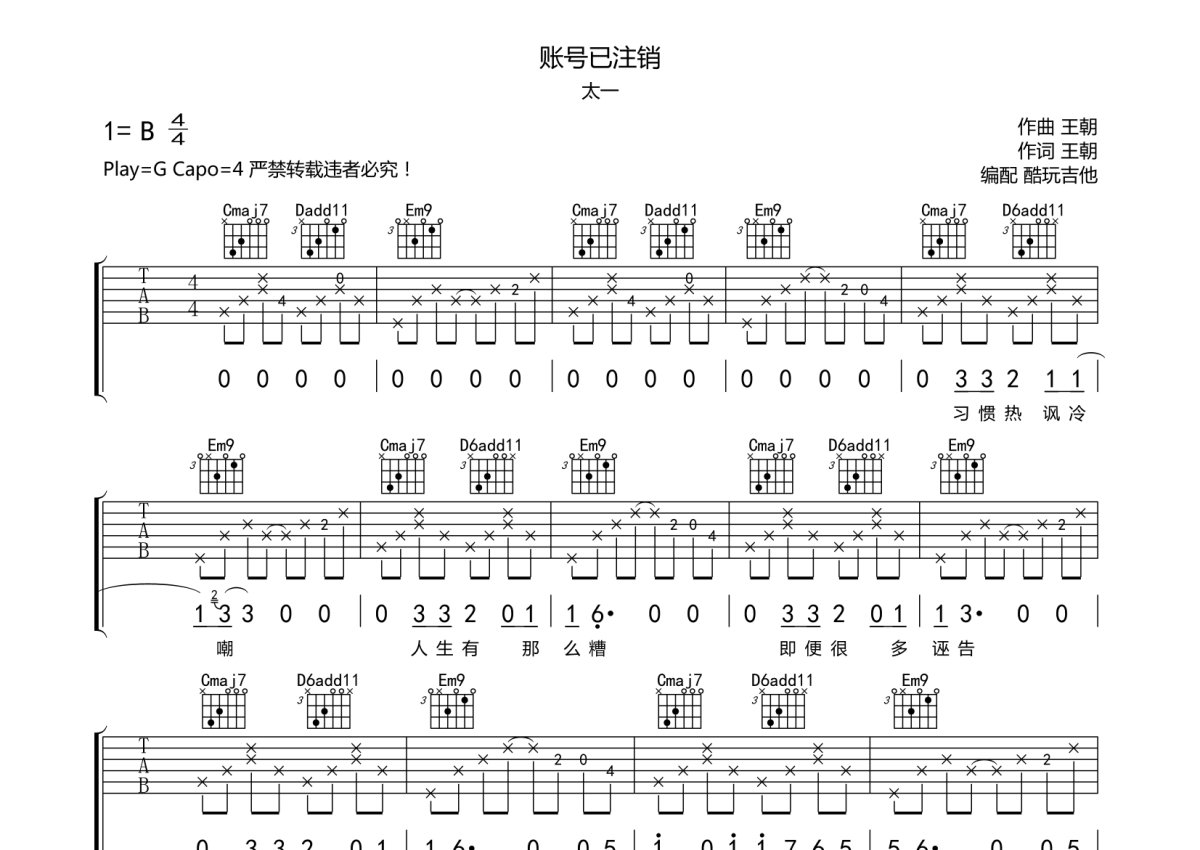 太一《账号已注销》吉他谱 - G调弹唱六线谱