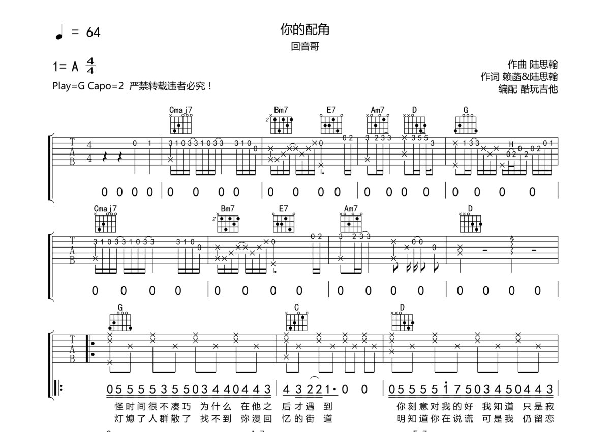 回音哥《你的配角》吉他谱 - G调弹唱六线谱