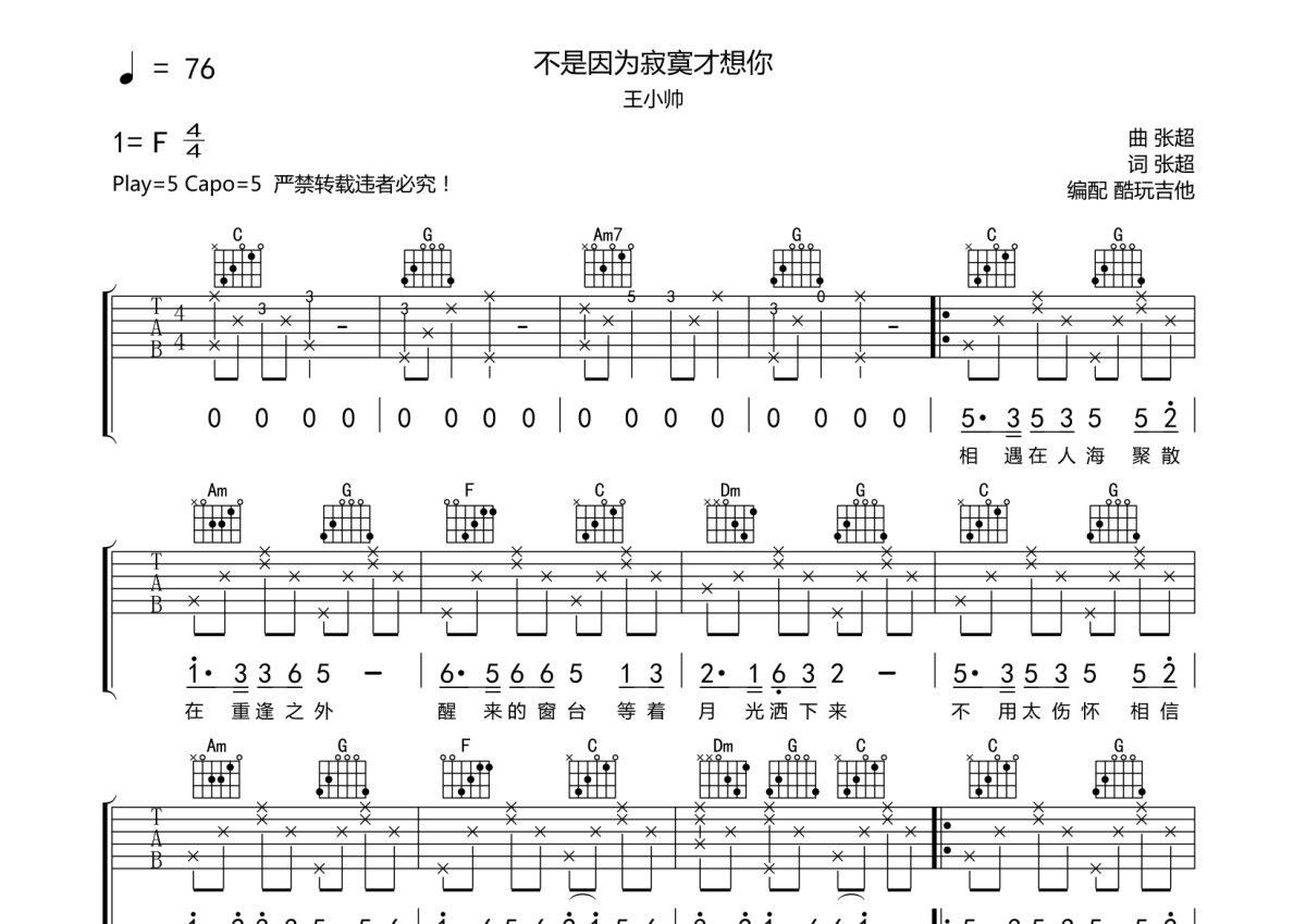 陶钰玉《不是因为寂寞才想你》吉他谱 - C调弹唱六线谱
