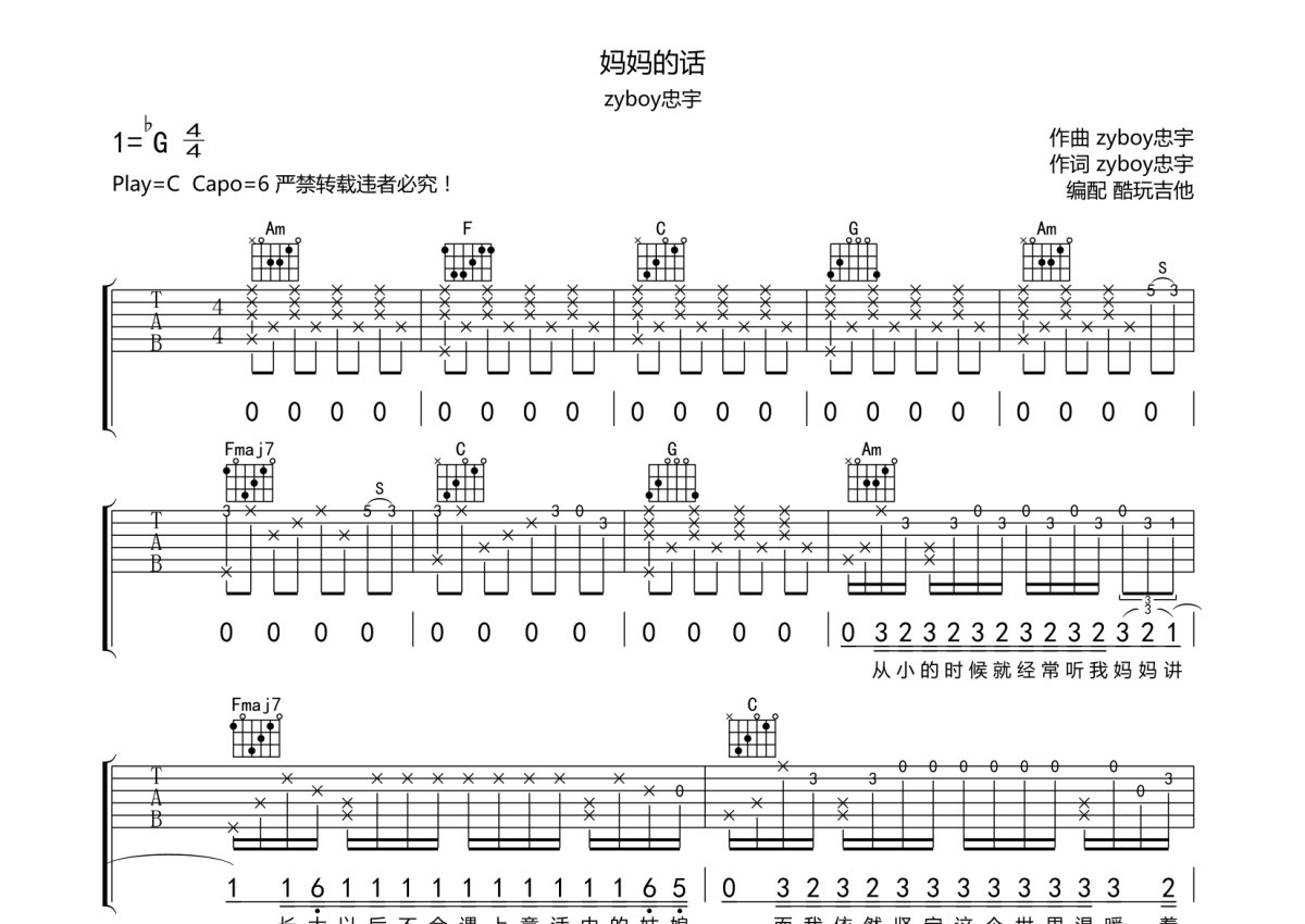 zyboy忠宇《听妈妈的话》吉他谱 - C调独奏六线谱
