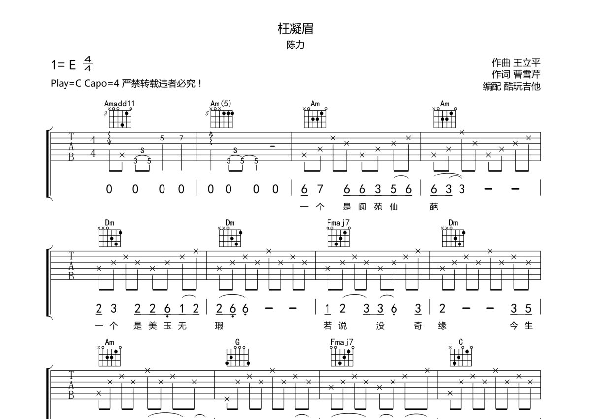 陈力《枉凝眉》吉他谱 - C调弹唱六线谱