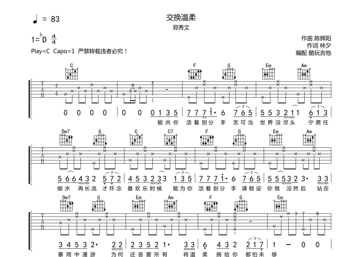 郑秀文《交换温柔》吉他谱 - C调弹唱六线谱