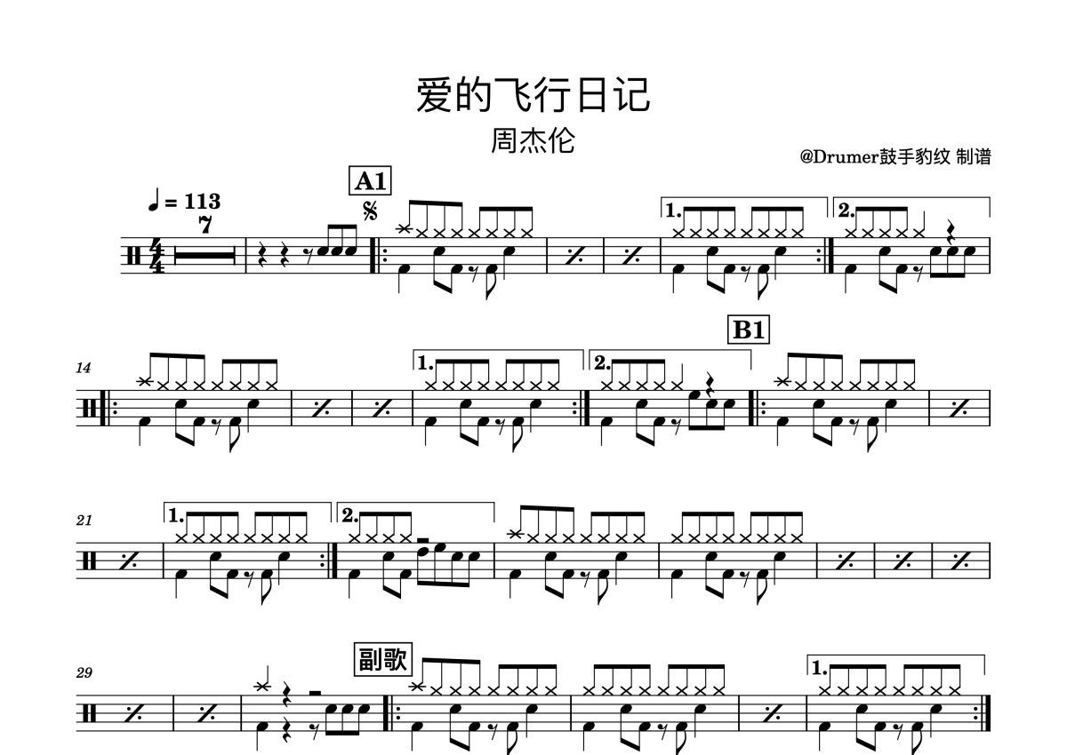 周杰伦《爱的飞行日记》鼓谱 - 架子鼓谱 - 完美版