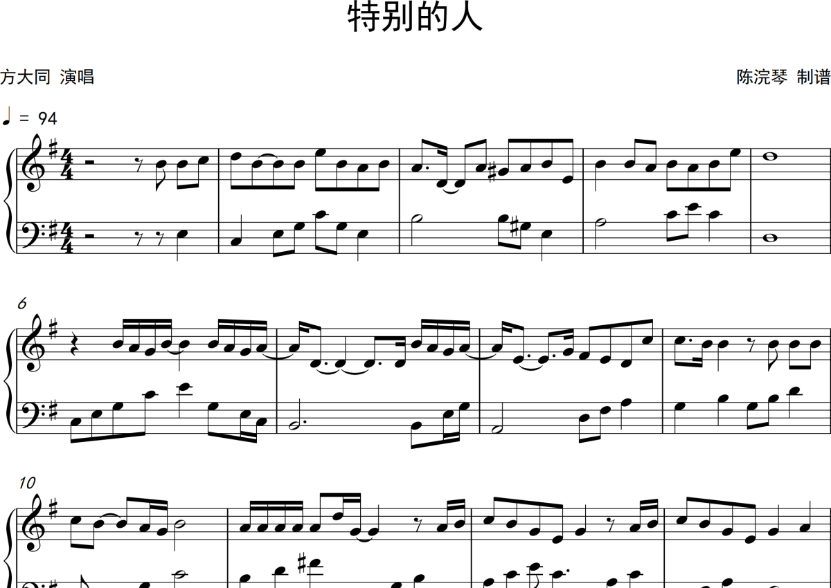《特别的人》是方大同演唱的一首歌曲,这份钢琴谱共有两张高清图谱,图谱由 @月隐云先知 编配上传,曲谱配备了相关的音频提供试听,使用这份特别的人钢琴谱,可以让你更加方便地掌握这首歌曲的演奏技巧,快来尝试吧。方大同《特别的人》钢琴谱。