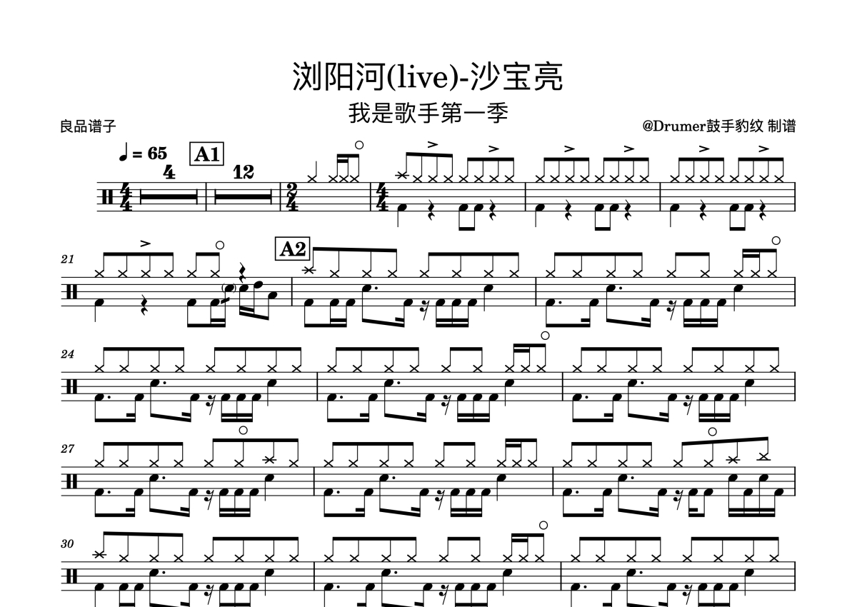 沙宝亮《浏阳河》鼓谱 - 架子鼓谱 - 我是歌手(live)