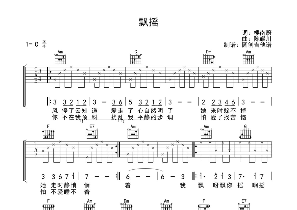 《飘摇》是周迅演唱的一首歌曲,本吉他谱采用的是C调指法编配,这份吉他谱共有一张高清图谱,图谱由 @圆创吉他谱 编配上传,图谱使用六线谱编配,包含吉他和弦指法、简谱以及歌词部分,曲谱配备了相关的音频提供试听,使用这份飘摇吉他谱,可以让你更加方便地掌握这首歌曲的弹唱技巧,快来尝试吧。