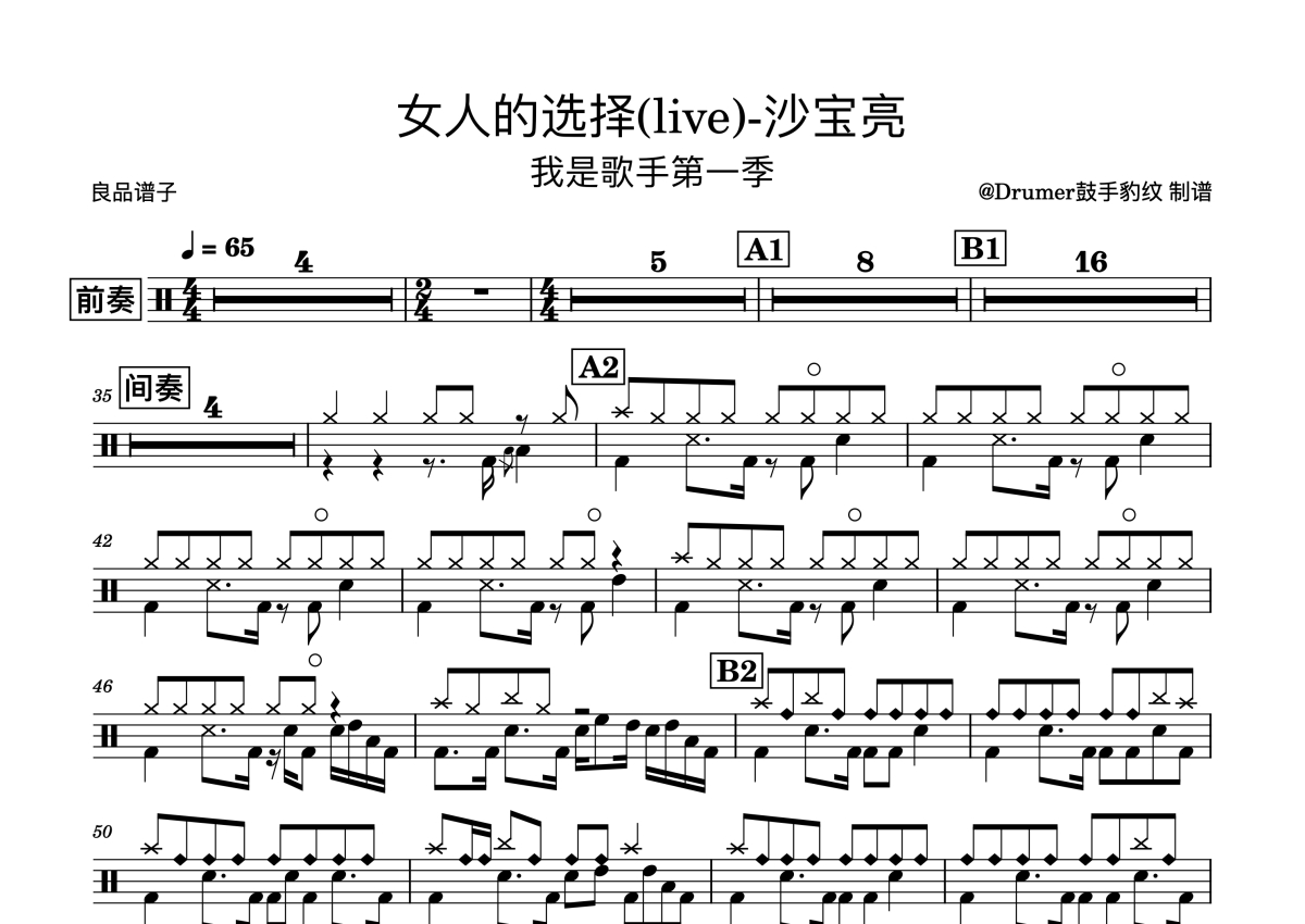 沙宝亮《女人的选择》鼓谱 - 架子鼓谱 - 我是歌手live