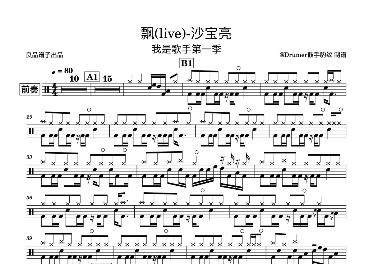沙宝亮《飘》鼓谱 - 架子鼓谱 - 我是歌手live