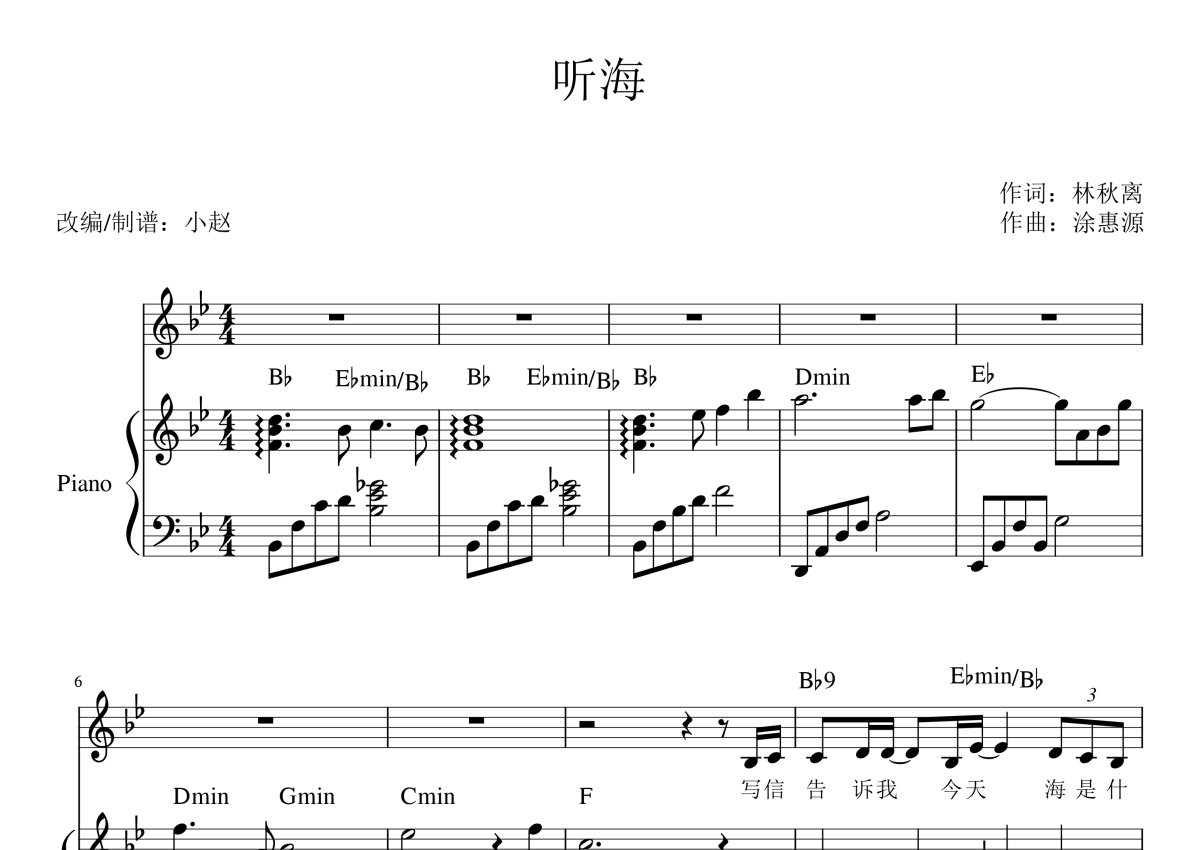 《听海》是张惠妹演唱的一首歌曲,这份钢琴谱共有三张高清图谱,图谱由 @Piano.赵先生 编配上传,使用这份听海钢琴谱,可以让你更加方便地掌握这首歌曲的演奏技巧,快来尝试吧。钢琴弹唱谱。