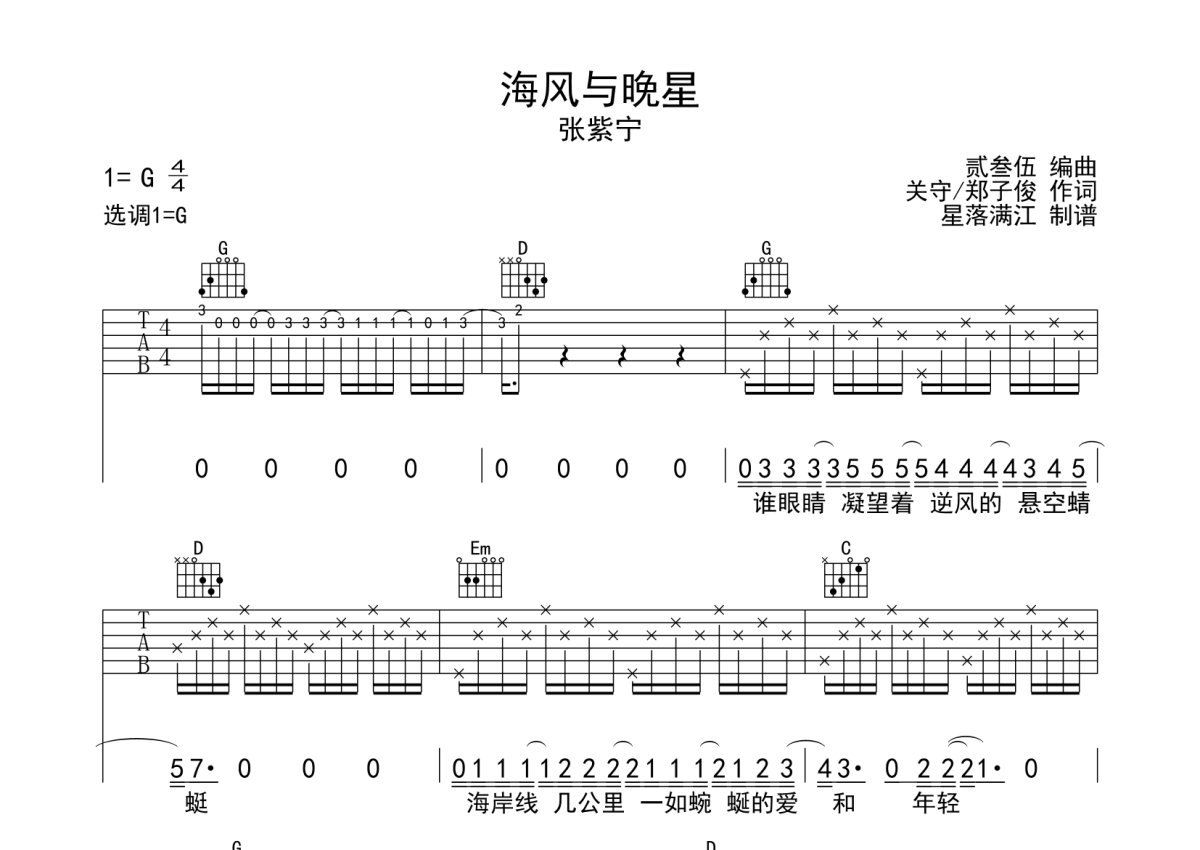 张紫宁《海风与晚星》吉他谱 - G调弹唱六线谱