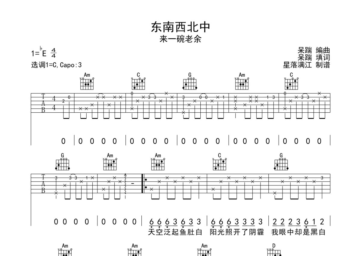来一碗牢狱《东南西北中》吉他谱 - C调弹唱六线谱