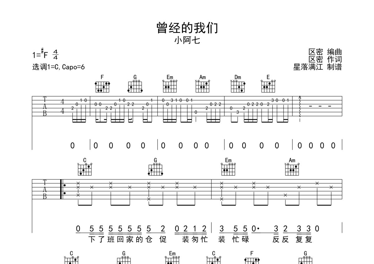 《曾经的我们》是小阿七演唱的一首歌曲,本吉他谱采用的是C调指法编配,这份吉他谱共有三张高清图谱,图谱由 @落 编配上传,图谱使用六线谱编配,包含吉他和弦指法、简谱以及歌词部分,使用这份曾经的我们吉他谱,可以让你更加方便地掌握这首歌曲的弹唱技巧,快来尝试吧。C调指法编配,简单好听,非常容易上手。