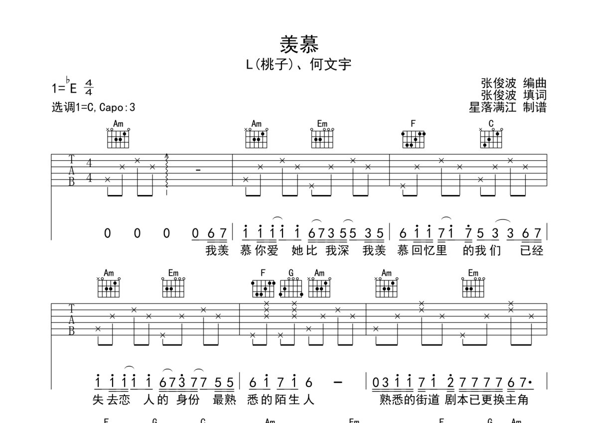 L(桃子)/何文宇《羡慕》吉他谱 - C调弹唱六线谱