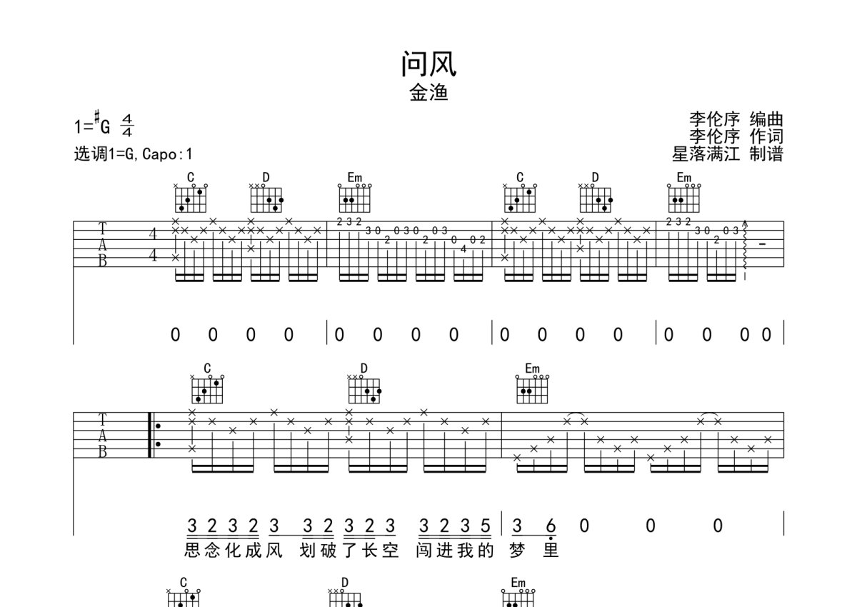金渔《问风》吉他谱 - G调弹唱六线谱