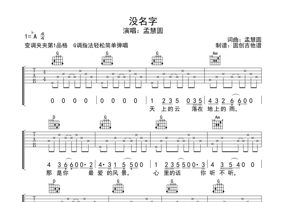 孟慧圆《没名字》吉他谱 - G调弹唱六线谱