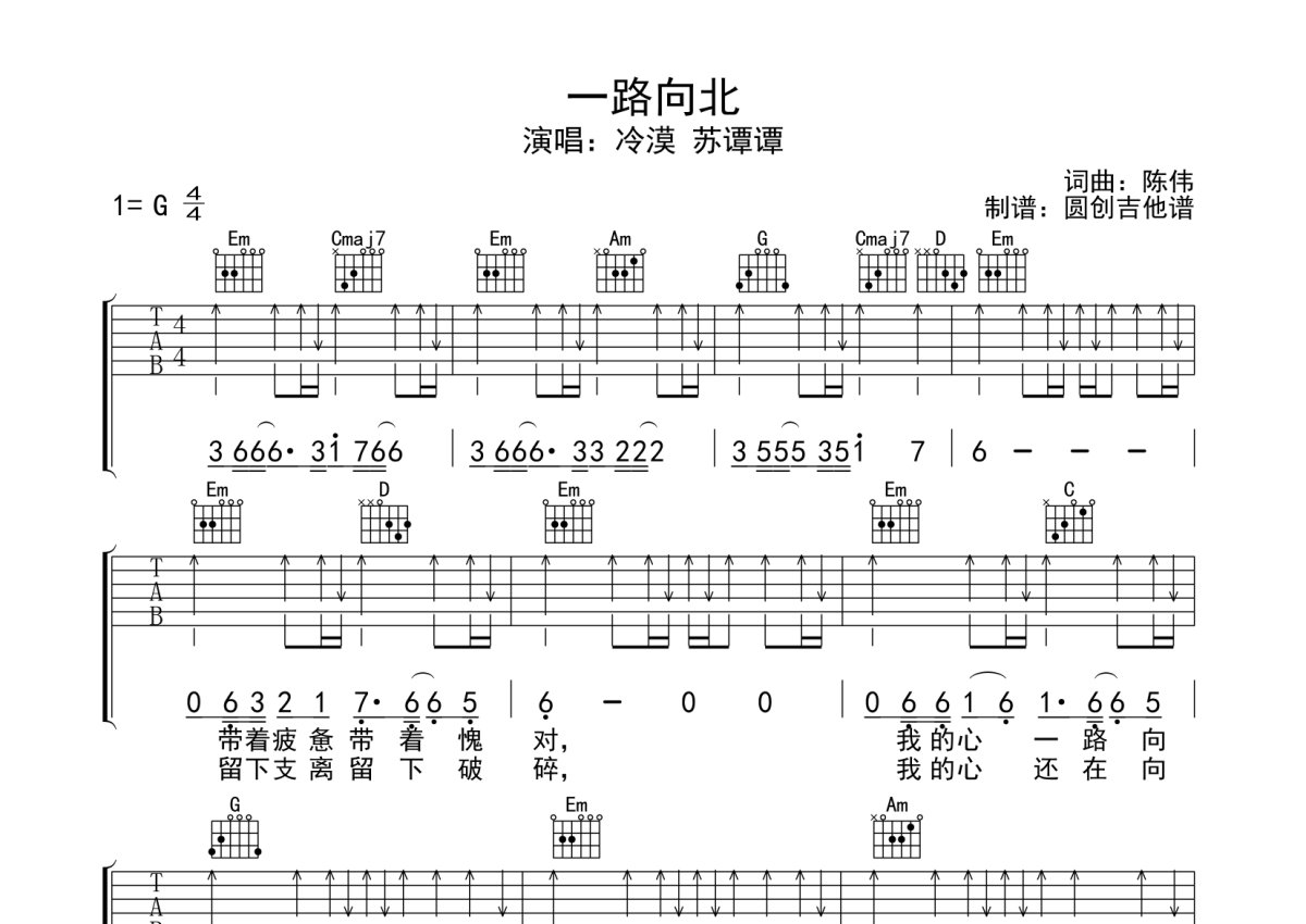 冷漠《一路向北》吉他谱 - G调弹唱六线谱