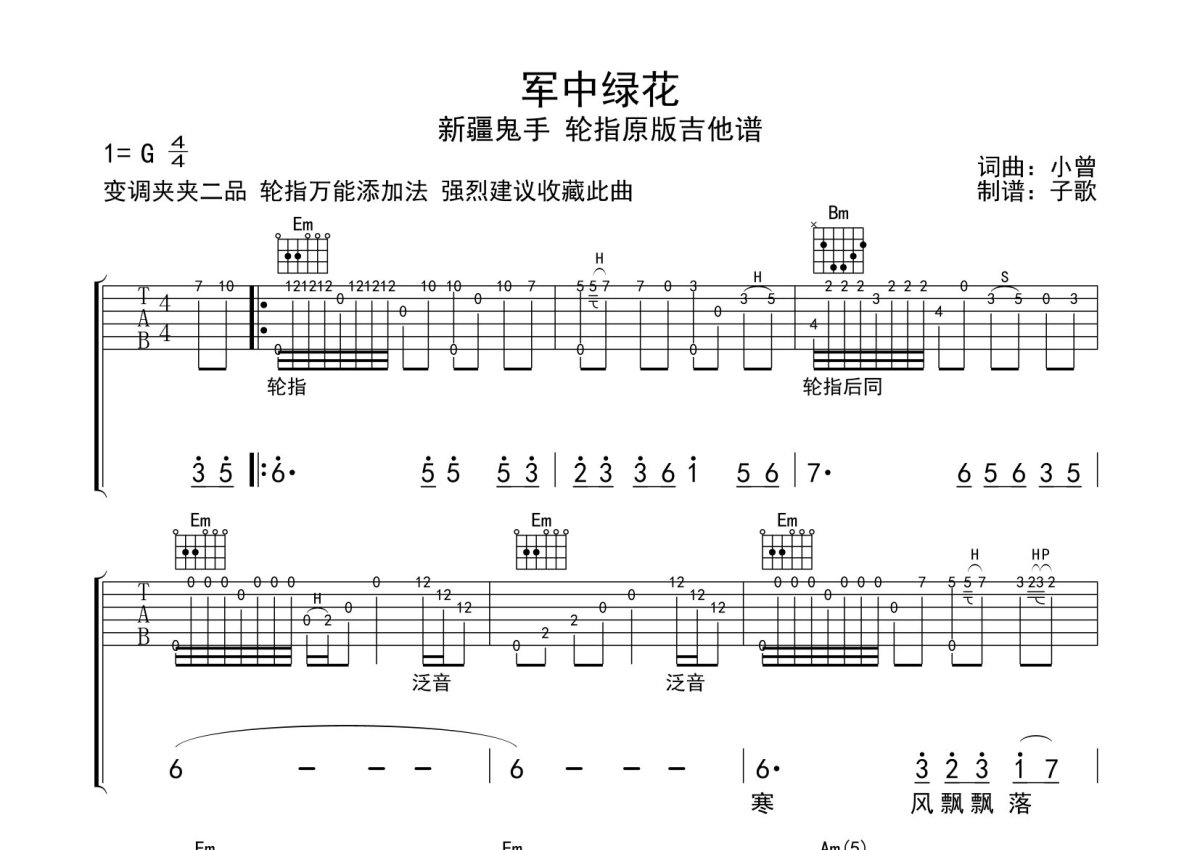 小曾《军中绿花》吉他谱 - G调独奏六线谱