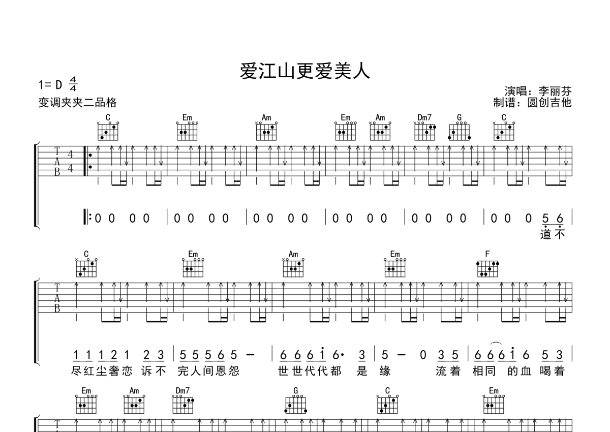 《爱江山更爱美人》是李芬兰演唱的一首歌曲,本吉他谱采用的是C调指法编配,这份吉他谱共有两张高清图谱,图谱由 @圆创吉他谱 编配上传,图谱使用六线谱编配,包含吉他和弦指法、简谱以及歌词部分,使用这份爱江山更爱美人吉他谱,可以让你更加方便地掌握这首歌曲的弹唱技巧,快来尝试吧。李芬兰《爱江山更爱美人》吉他弹唱谱,采用C调指法编配,一路向北编配出品,共有2张高清图谱,免翻页排版设计。
