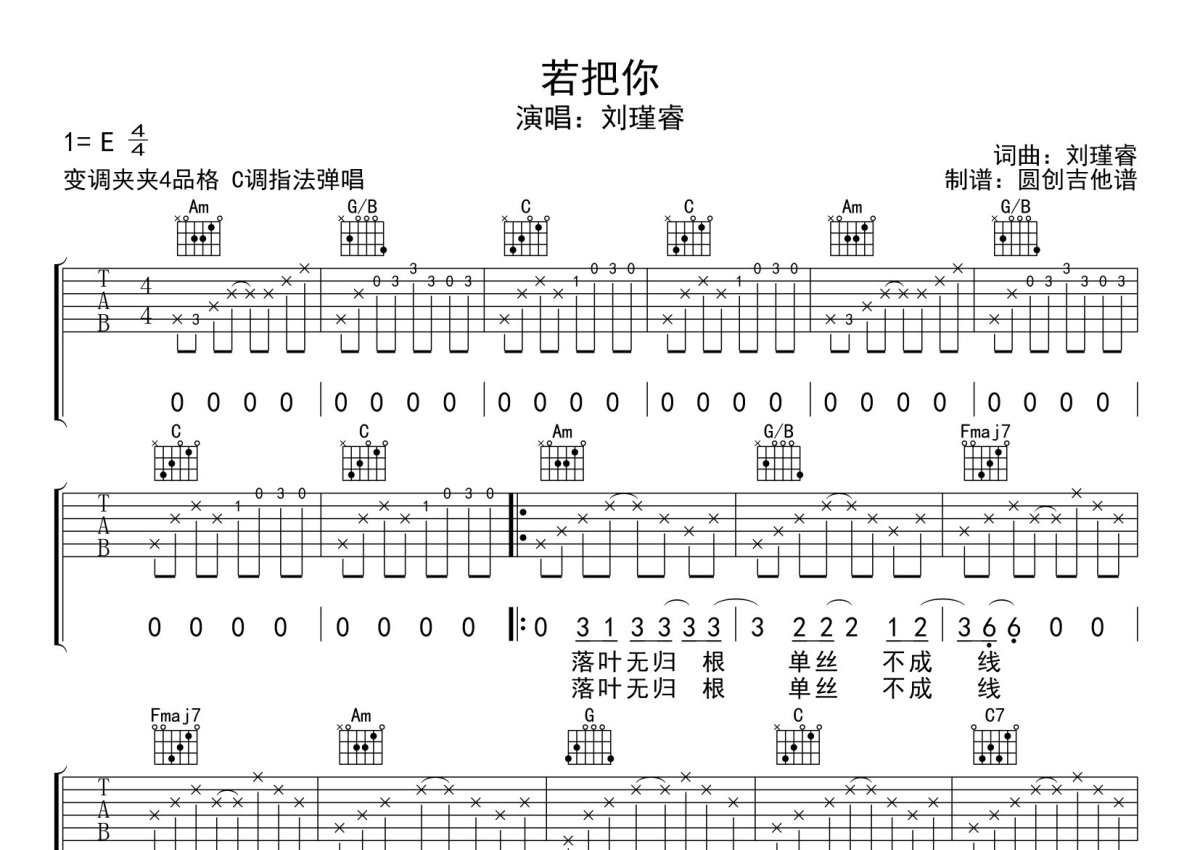 刘瑾睿《若把你》吉他谱 - E调弹唱六线谱