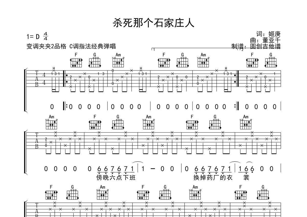 《杀死那个石家庄人》是万能青年旅店演唱的一首歌曲,本吉他谱采用的是C调指法编配,这份吉他谱共有三张高清图谱,图谱由 @圆创吉他谱 编配上传,图谱使用六线谱编配,包含吉他和弦指法、简谱以及歌词部分,曲谱配备了相关的音频提供试听,使用这份杀死那个石家庄人吉他谱,可以让你更加方便地掌握这首歌曲的弹唱技巧,快来尝试吧。