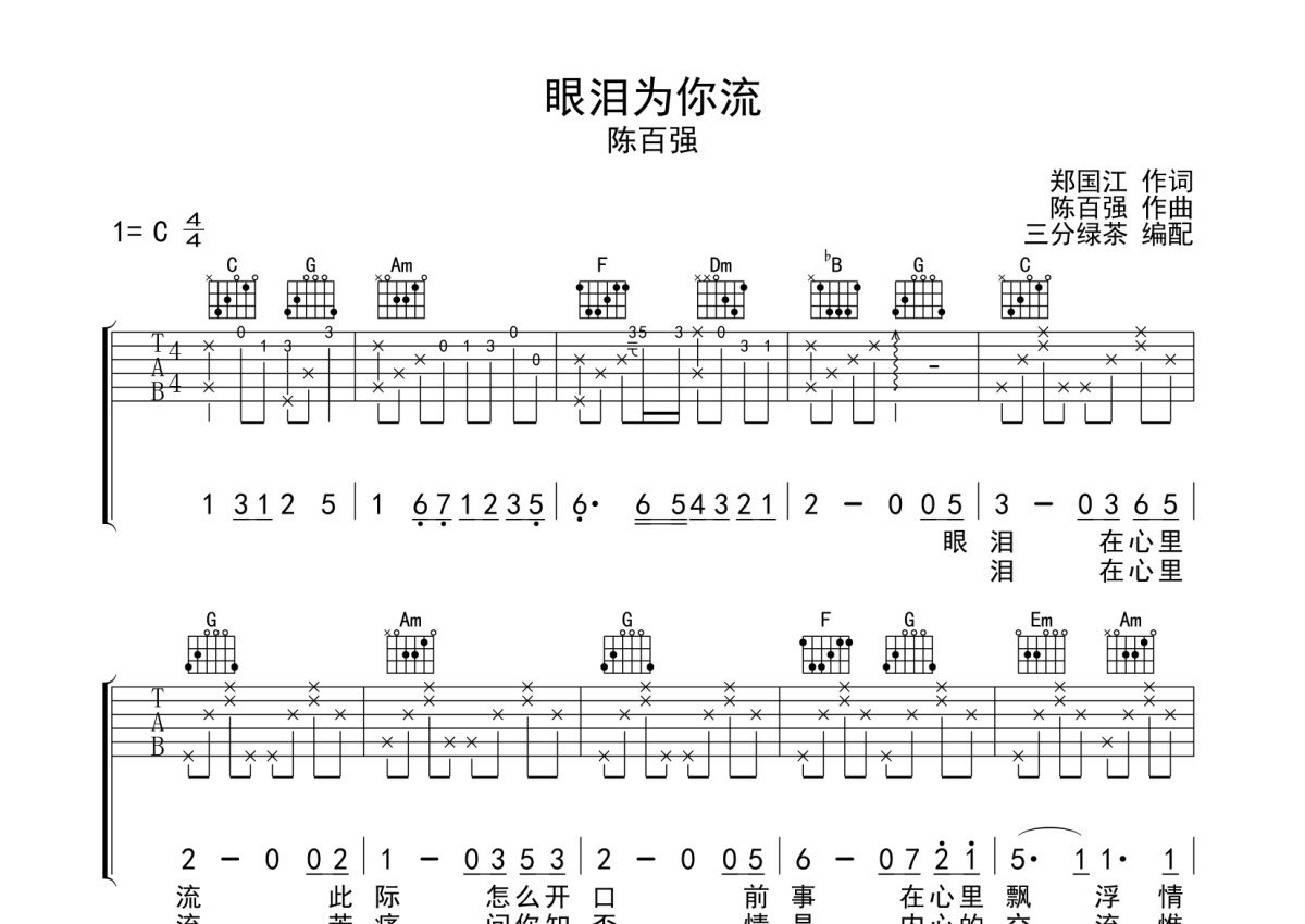 陈百强《眼泪为你流》吉他谱 - C调弹唱六线谱