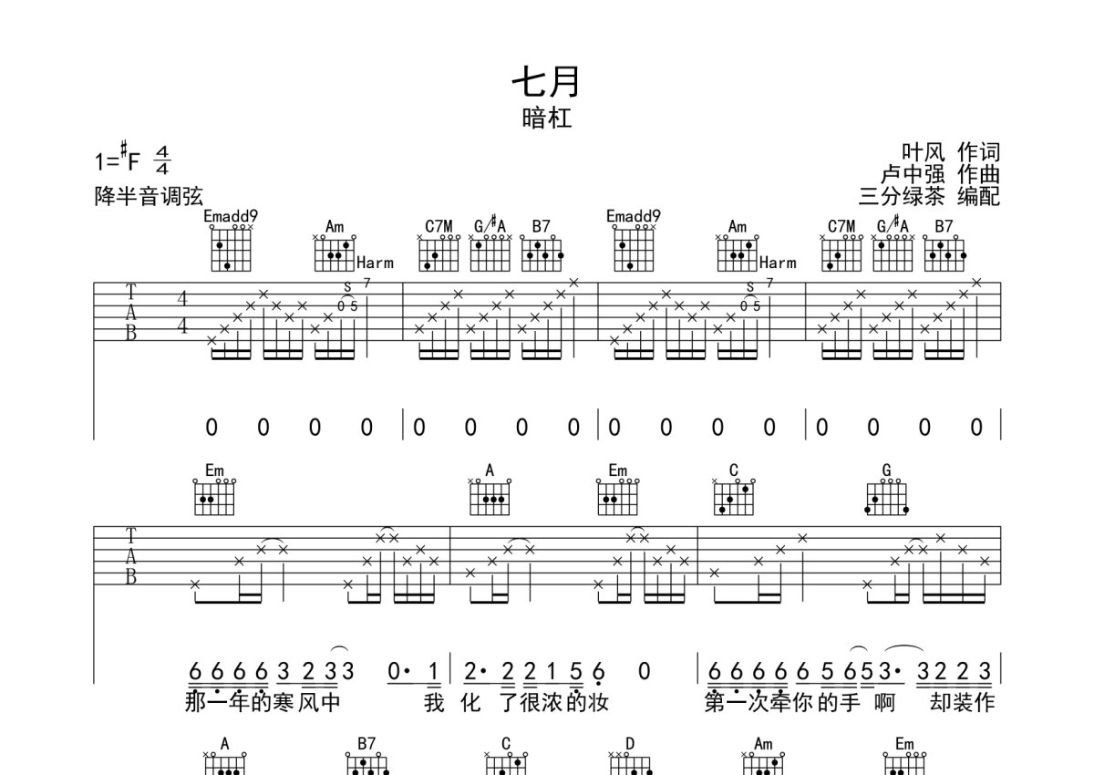 暗杠《七月》吉他谱 - G调弹唱六线谱