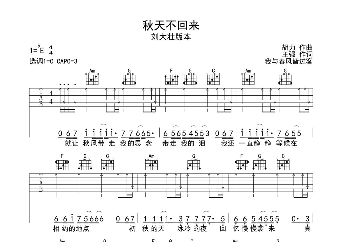 刘大壮版本《秋天不回来》吉他谱 - C调弹唱六线谱
