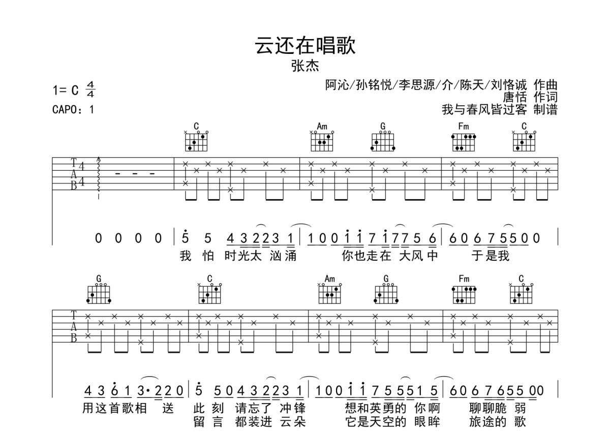 张杰《云还在唱歌》吉他谱 - C调弹唱六线谱