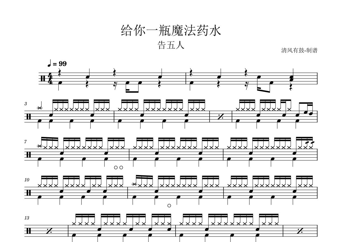 《给你一瓶魔法药水》是告五人乐队演唱的一首歌曲,原版,歌曲速度为每分钟99拍,这份鼓谱共有三张高清图谱,图谱由 @王远康 编配上传,图谱使用五线谱编配,使用这份给你一瓶魔法药水架子鼓谱,你将能够轻松地敲打出这首告五人乐队的给你一瓶魔法药水,快来尝试吧。