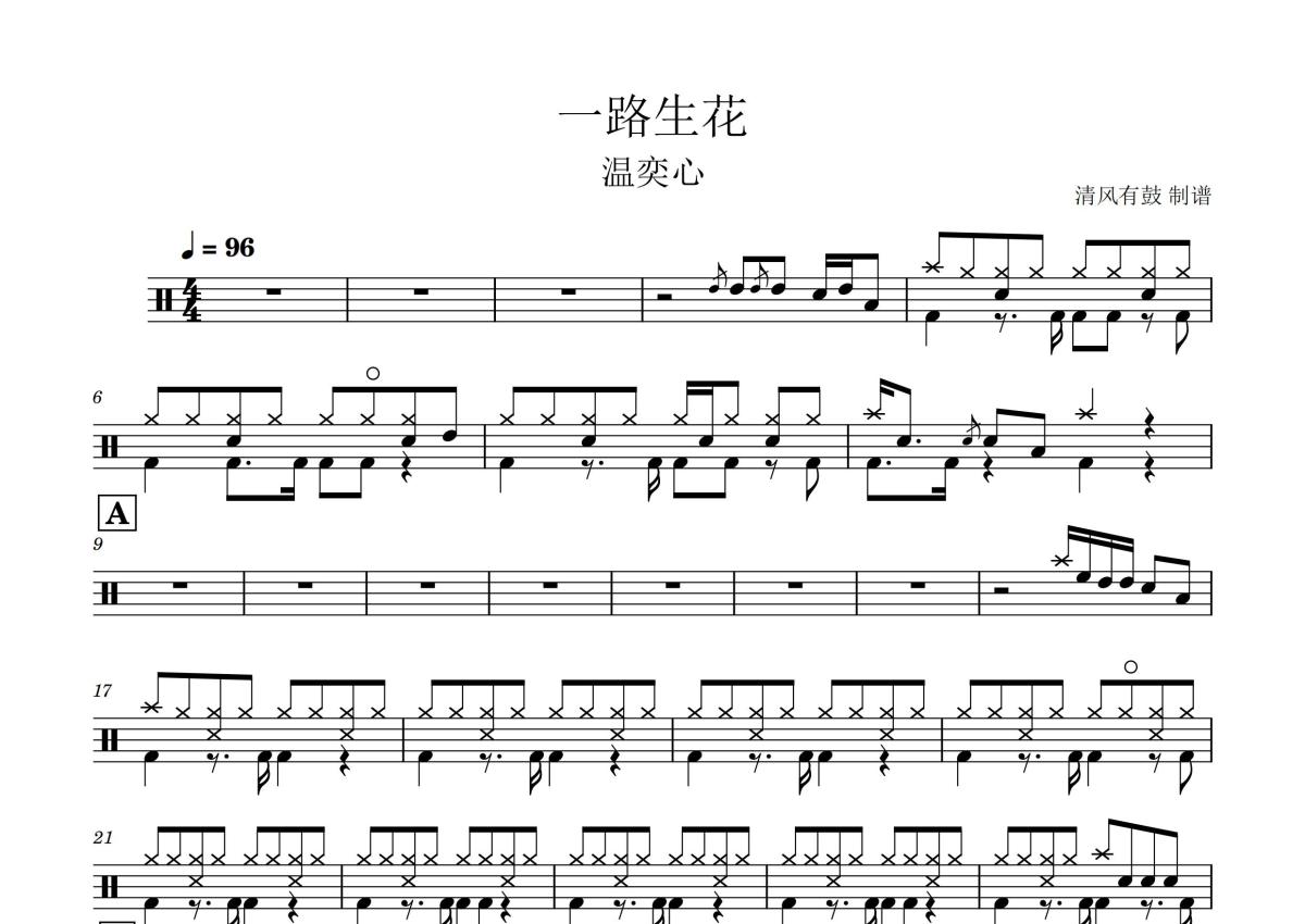 温奕心《一路生花》鼓谱 - 架子鼓谱