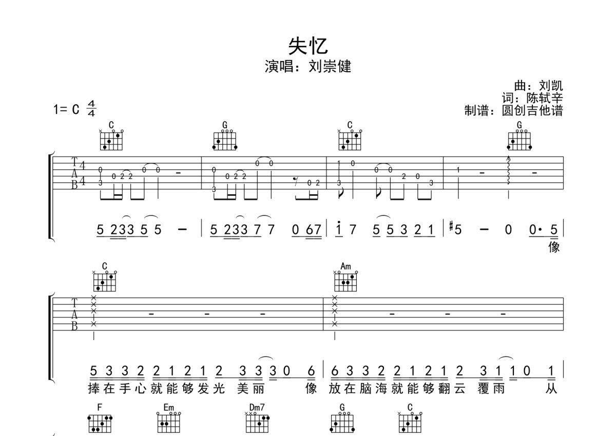 刘崇健《失忆》吉他谱 - C调弹唱六线谱