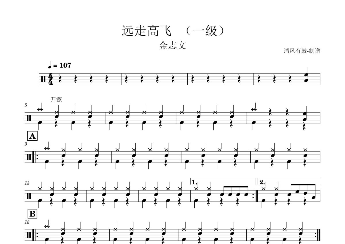 《远走高飞 一级》是金志文演唱的一首歌曲,这份鼓谱共有两张高清图谱,图谱由 @王远康 编配上传,图谱使用五线谱编配,使用这份远走高飞 一级架子鼓谱,你将能够轻松地敲打出这首金志文的远走高飞 一级,快来尝试吧。金志文《远走高飞一级》架子鼓谱,清风有鼓编配出品,共有2张高清图谱,免翻页排版设计。