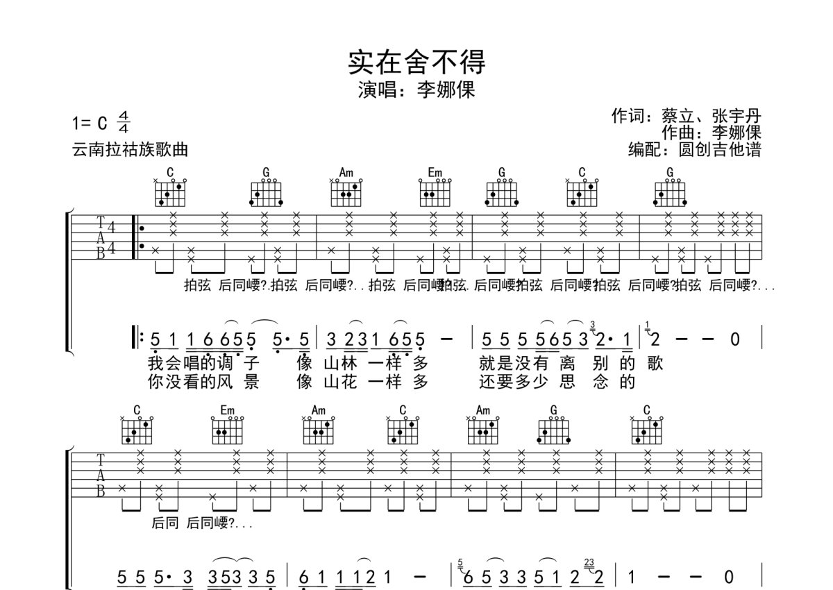 李娜倮《实在舍不得》吉他谱 - C调弹唱六线谱