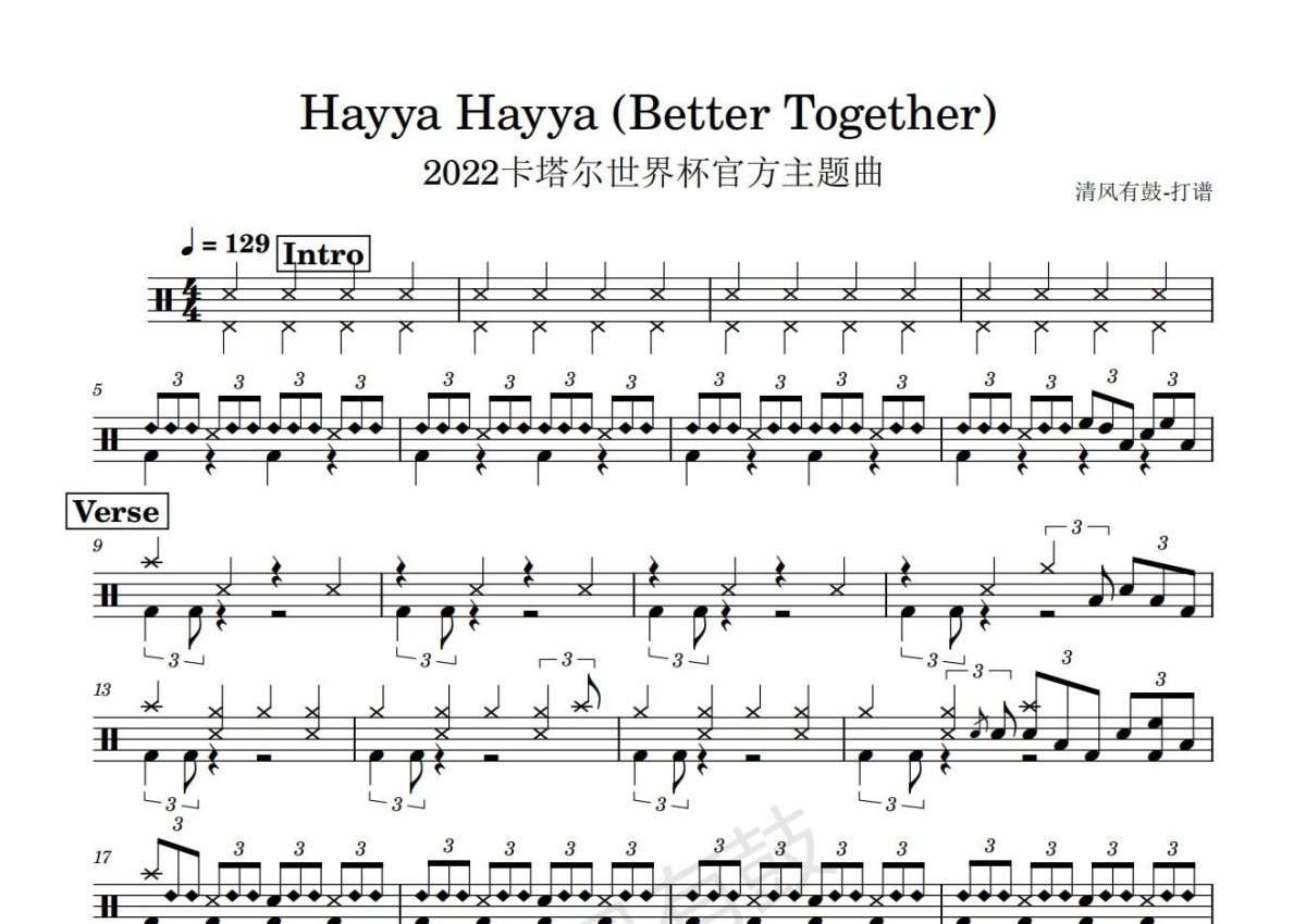 《《Hayya Hayya》 2022卡塔尔世界杯主题曲》是2022卡塔尔世界杯主题曲演唱的一首歌曲,这份鼓谱共有三张高清图谱,图谱由 @王远康 编配上传,图谱使用五线谱编配,使用这份《Hayya Hayya》 2022卡塔尔世界杯主题曲架子鼓谱,你将能够轻松地敲打出这首2022卡塔尔世界杯主题曲的《Hayya Hayya》 2022卡塔尔世界杯主题曲,快来尝试吧。2022卡塔尔世界杯主题曲《《HayyaHayya》2022卡塔尔世界杯主题曲》架子鼓谱,清风有鼓编配出品,共有3张高清图谱。