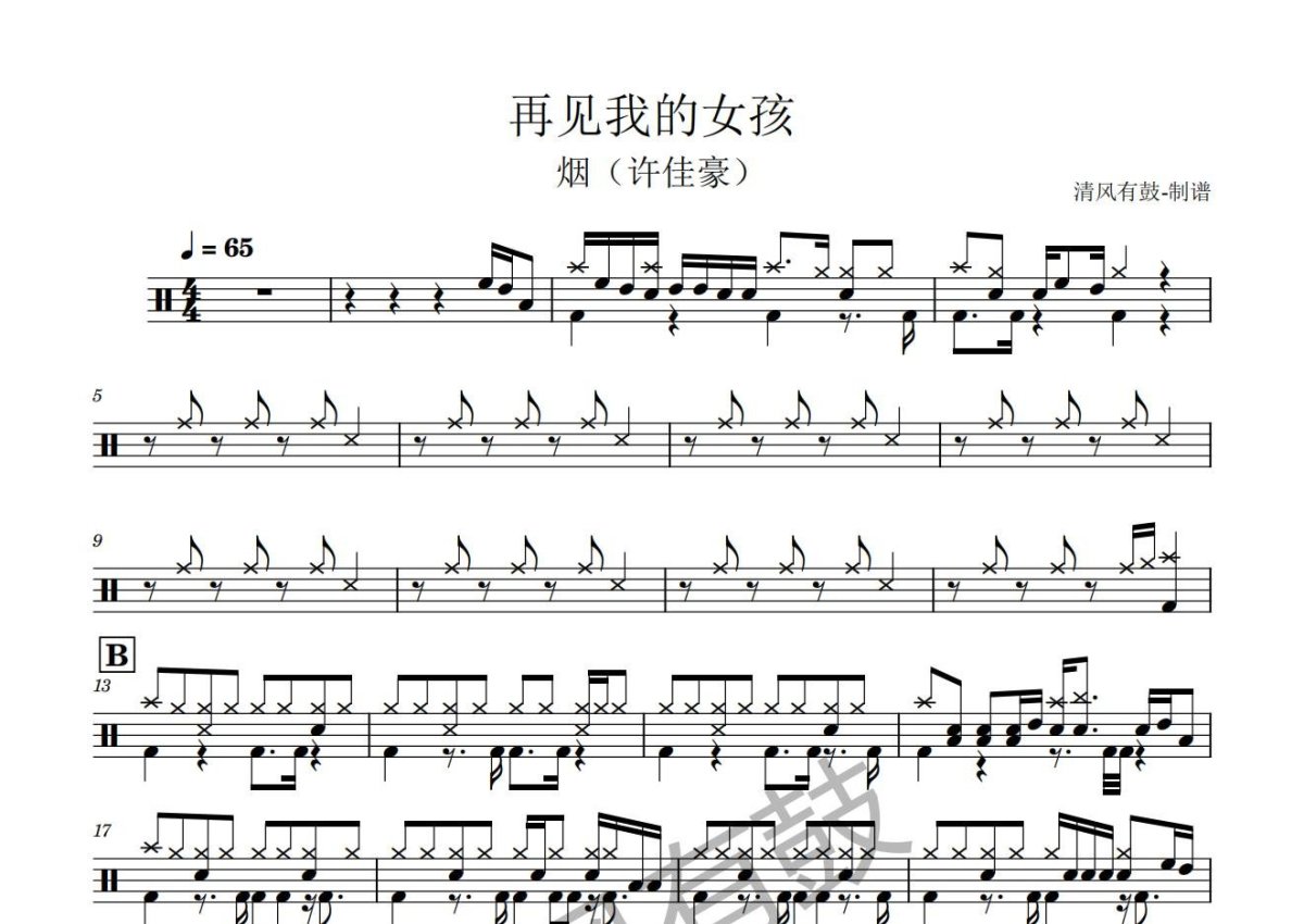 《再见我的女孩》是烟(许佳豪)演唱的一首歌曲,这份鼓谱共有两张高清图谱,图谱由 @王远康 编配上传,图谱使用五线谱编配,使用这份再见我的女孩架子鼓谱,你将能够轻松地敲打出这首烟(许佳豪)的再见我的女孩,快来尝试吧。烟(许佳豪)《再见我的女孩》架子鼓谱,清风有鼓编配出品,共有2张高清图谱,免翻页排版设计。