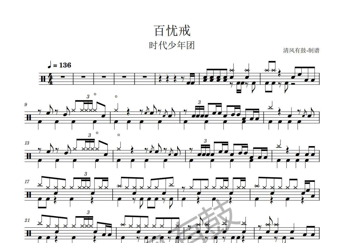 《百优戒》是时代少年团演唱的一首歌曲,这份鼓谱共有三张高清图谱,图谱由 @王远康 编配上传,图谱使用五线谱编配,使用这份百优戒架子鼓谱,你将能够轻松地敲打出这首时代少年团的百优戒,快来尝试吧。《百忧戒》时代少年团架子鼓动态鼓谱最近很多中学生喜欢的歌曲,但也有难度。