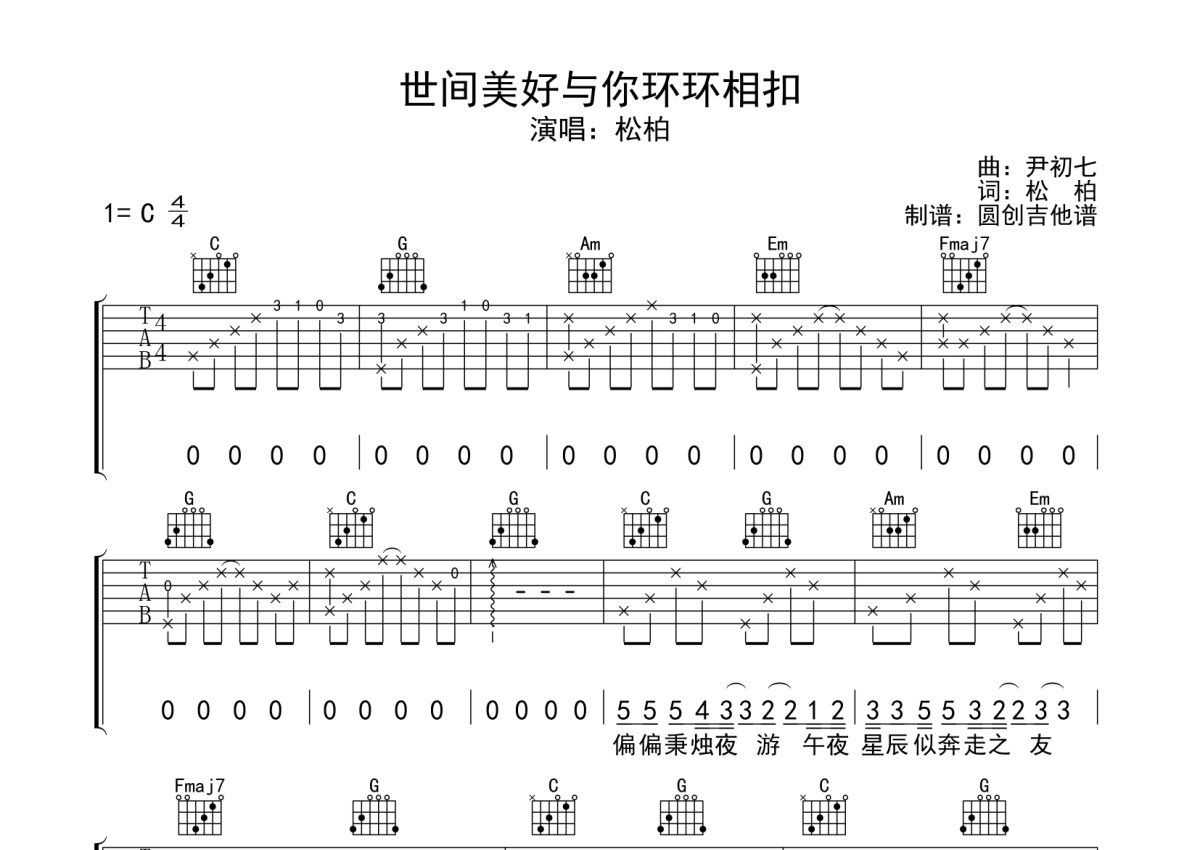 松柏《世界美好与你环环相扣》吉他谱 - C调弹唱六线谱