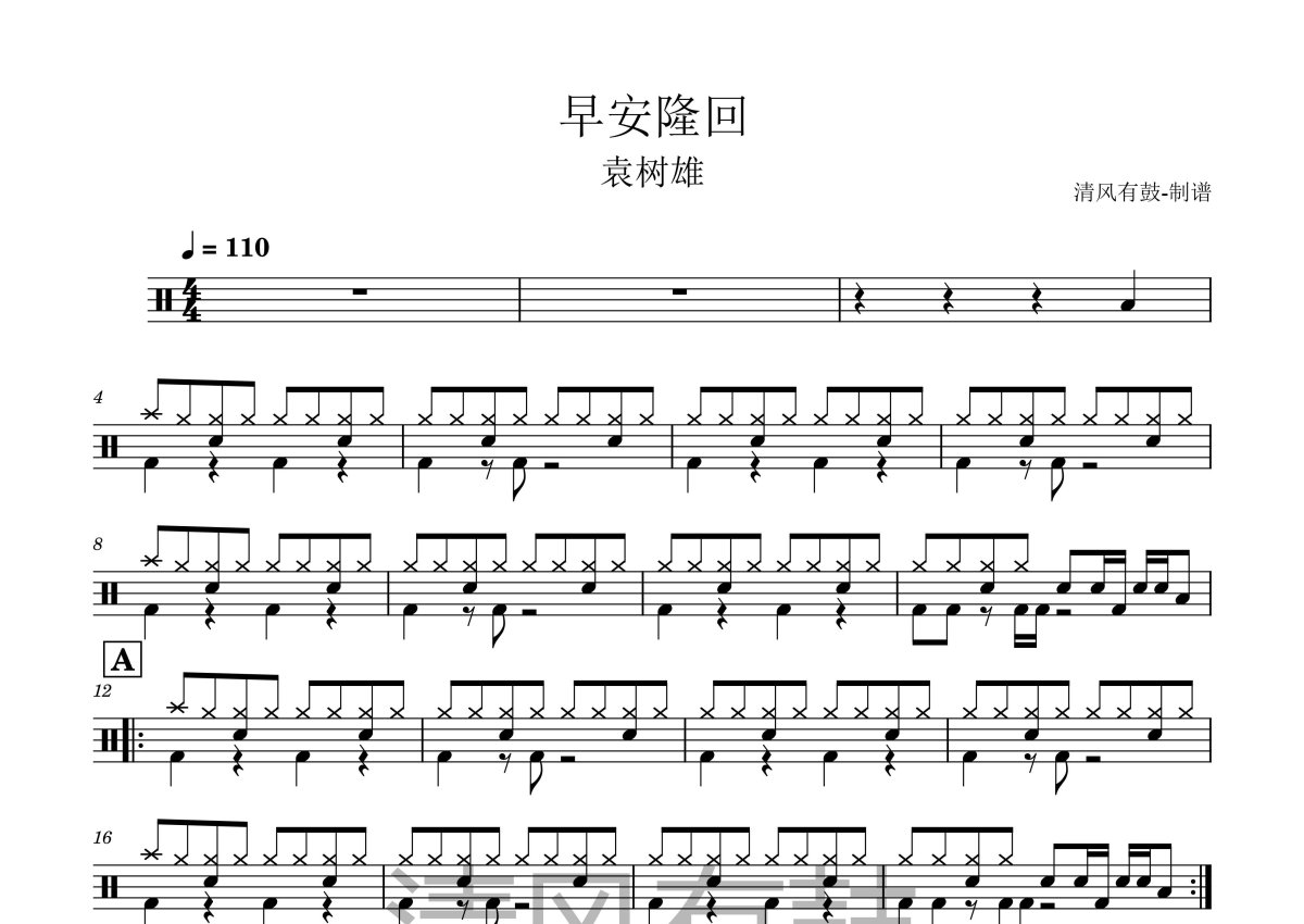 《早安隆回》是袁树雄演唱的一首歌曲,这份鼓谱共有两张高清图谱,图谱由 @王远康 编配上传,图谱使用五线谱编配,使用这份早安隆回架子鼓谱,你将能够轻松地敲打出这首袁树雄的早安隆回,快来尝试吧。袁树雄《早安隆回》架子鼓谱,清风有鼓编配出品,共有2张高清图谱,免翻页排版设计。