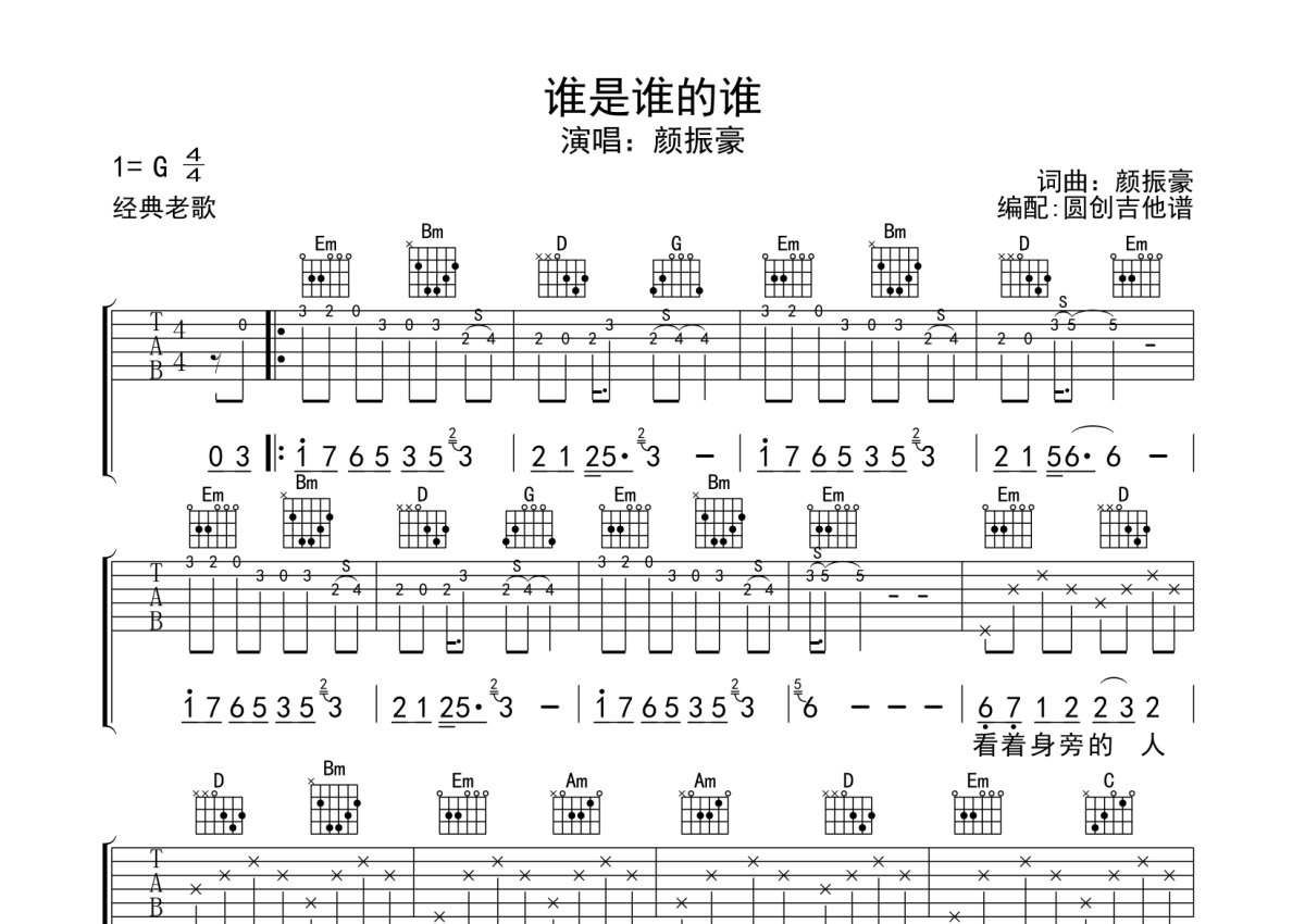 颜振豪《谁是谁的谁》吉他谱 - G调弹唱六线谱