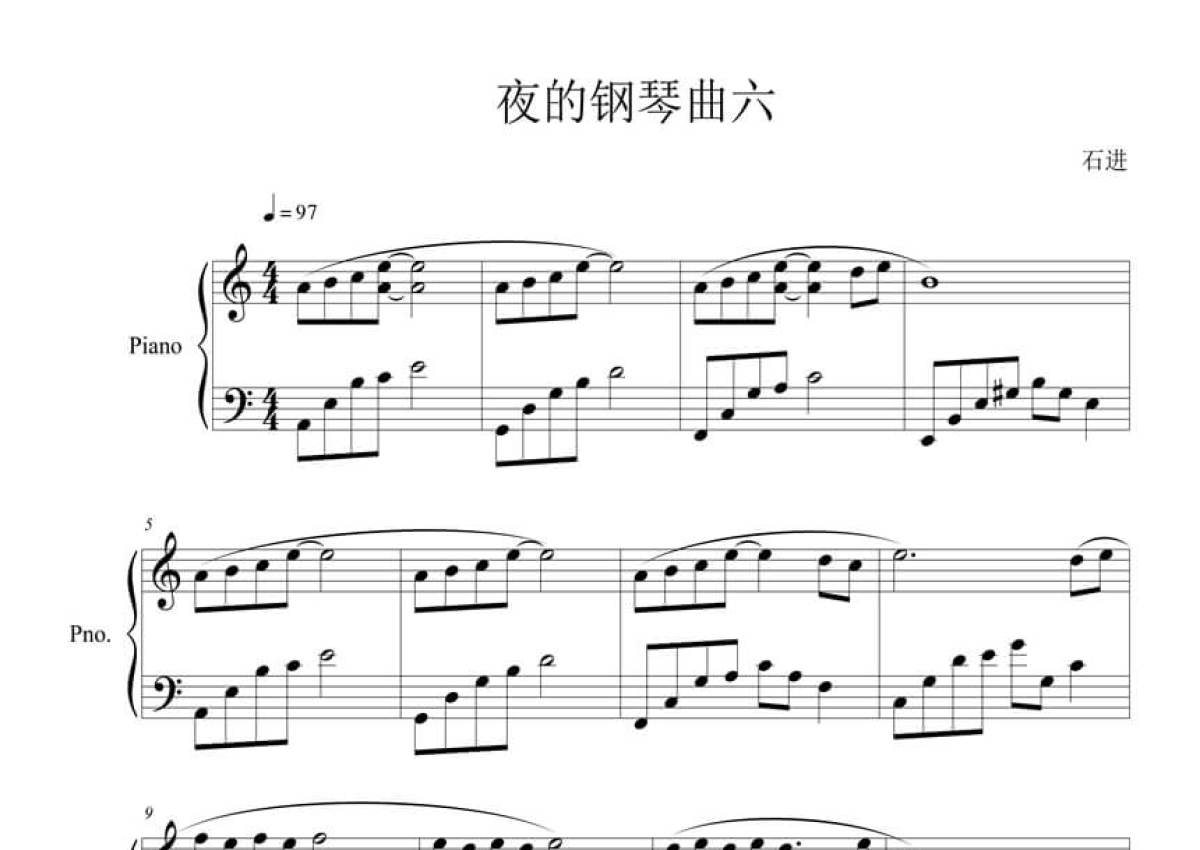 《夜的钢琴曲No.6》是石进演唱的一首歌曲,这份钢琴谱共有五张高清图谱,图谱由 @Corpse-R@yMan 编配上传,使用这份夜的钢琴曲No.6钢琴谱,可以让你更加方便地掌握这首歌曲的演奏技巧,快来尝试吧。石进《夜的钢琴曲No.6》钢琴谱,Corpse-R@yMan编配出品,共有5张高清图谱。