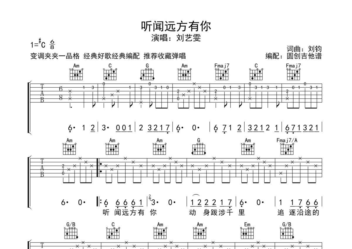 《听闻远方有你》是刘艺雯演唱的一首歌曲,本吉他谱采用的是C调指法编配,这份吉他谱共有两张高清图谱,图谱由 @圆创吉他谱 编配上传,图谱使用六线谱编配,包含吉他和弦指法、简谱以及歌词部分,曲谱配备了相关的音频提供试听,使用这份听闻远方有你吉他谱,可以让你更加方便地掌握这首歌曲的弹唱技巧,快来尝试吧。