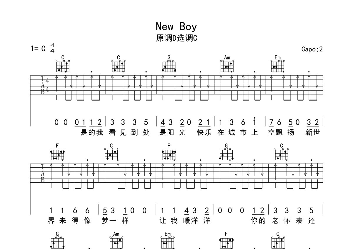 朴树《new boy》吉他谱 - C调弹唱六线谱