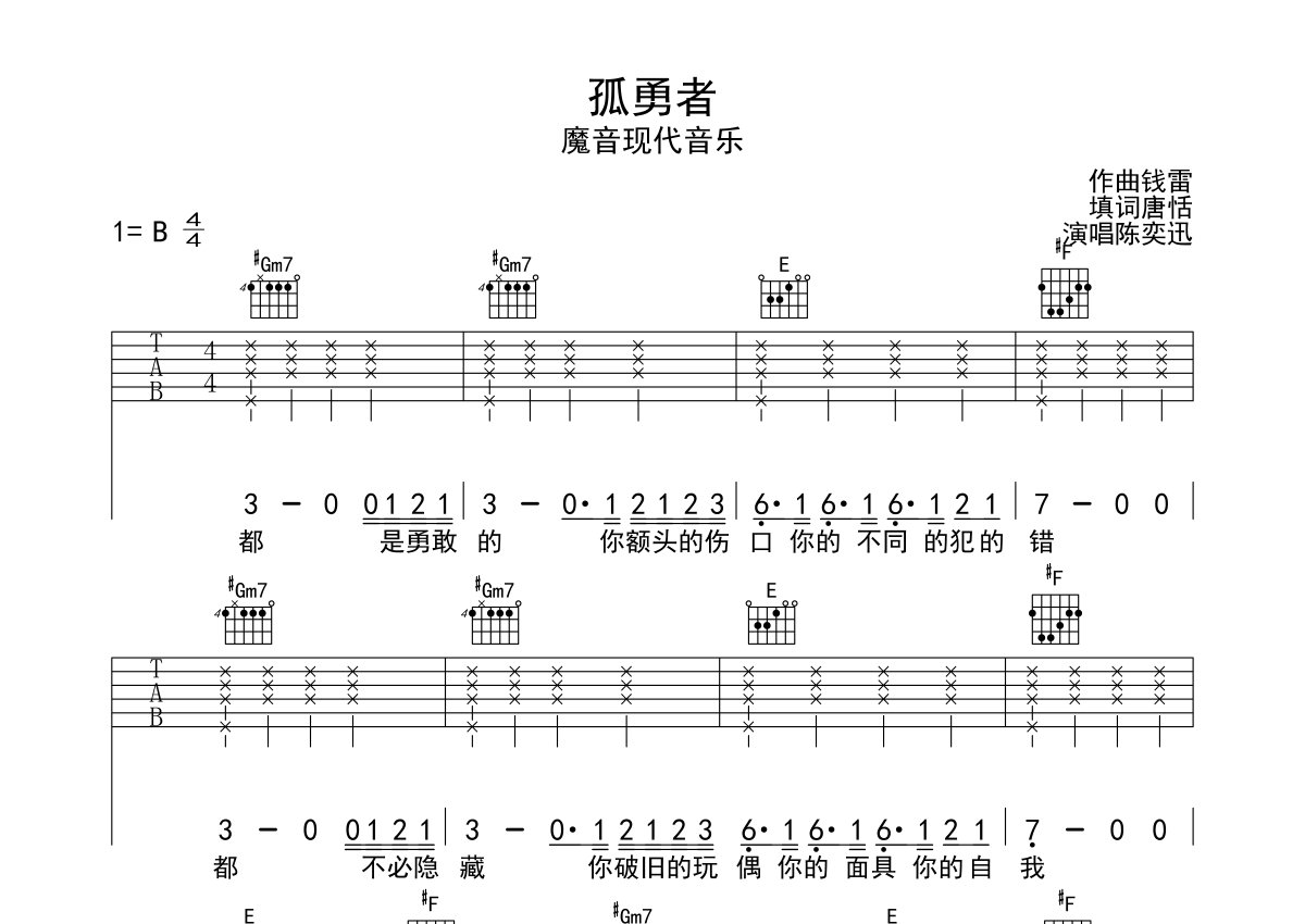 《孤勇者》是陈奕迅演唱的一首歌曲,本吉他谱采用的是B调指法编配,这份吉他谱共有四张高清图谱,图谱由 @mono 编配上传,图谱使用六线谱编配,包含吉他和弦指法、简谱以及歌词部分,曲谱配备了相关的音频提供试听,使用这份孤勇者吉他谱,可以让你更加方便地掌握这首歌曲的弹唱技巧,快来尝试吧。陈奕迅《孤勇者》吉他弹唱谱,采用B调指法编配,郑韩金手指吉他教育新郑分部编配出品,共有4张高清图谱。
