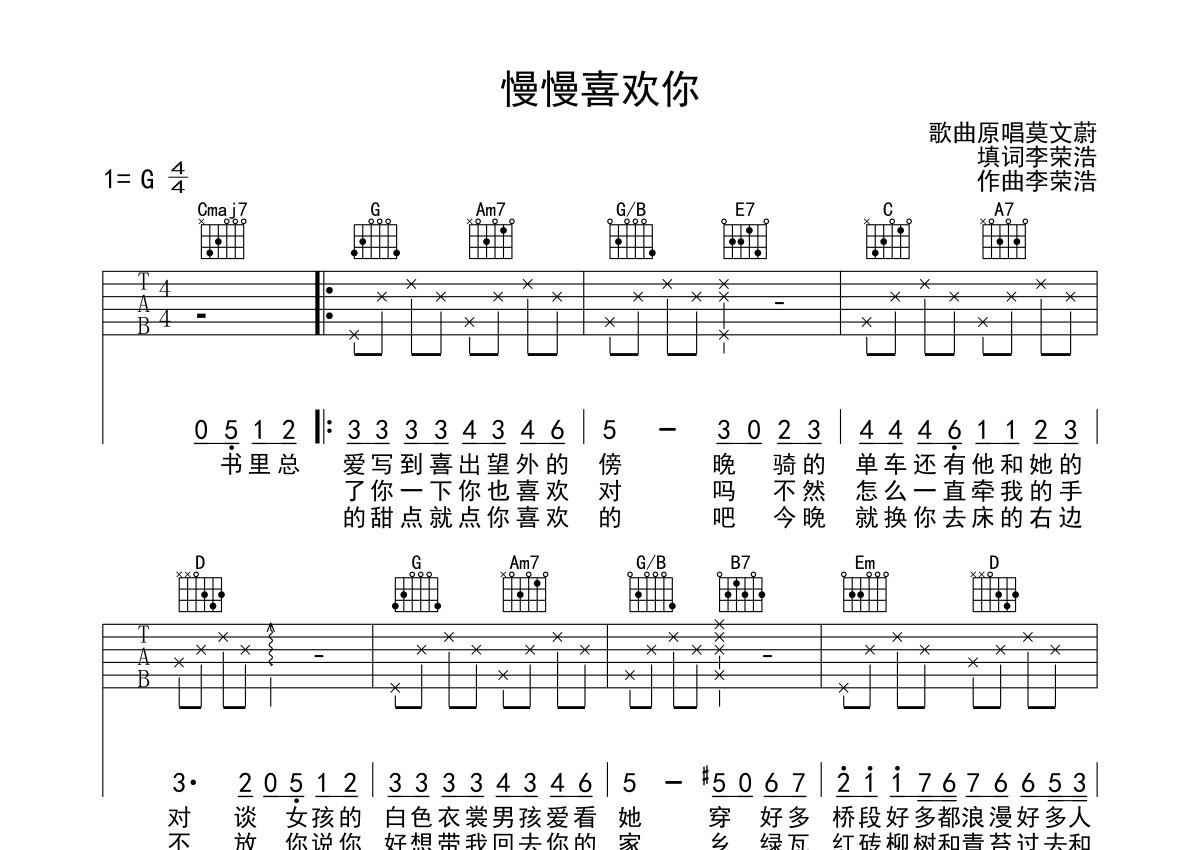 莫文蔚《慢慢喜欢你》吉他谱 - G调弹唱六线谱
