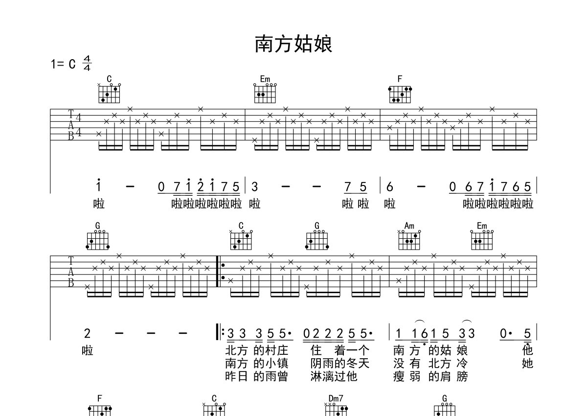 赵雷《南方姑娘》吉他谱 - C调弹唱六线谱